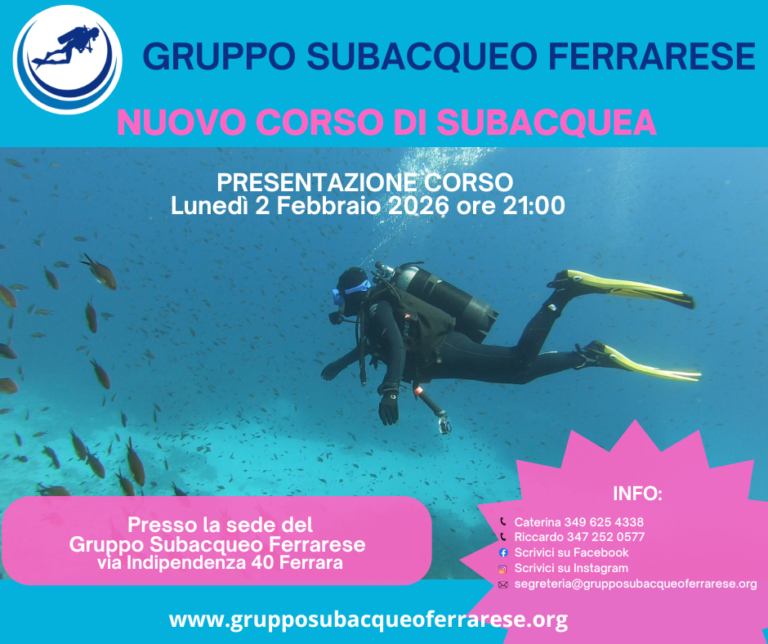 Presentazione corso Open Water Diver 24 Gennaio 2022 Avvio corsi 2022 con il GSF – lunedì 7 Febbraio 2022 presentazione corso Open Water Diver Il Gruppo Subacqueo Ferrarese è lieto di annunciare che
